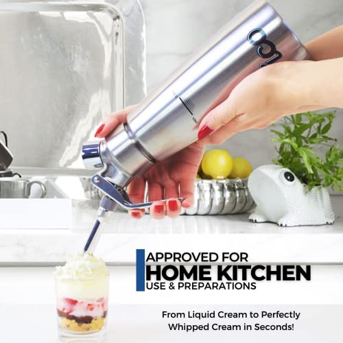 - Excellence Professionnelle – Notre syphon cuisine chantilly de qualité industrielle est conçu pour les cuisines professionnelles et l’usage intensif. Parfait pour les baristas, traiteurs et chefs, mais aussi idéal pour votre cuisine à la maison. Créez facilement des crèmes onctueuses, mousses sucrées ou salées, sauces aérées chaudes ou froides, soupes, espumas espagnoles traditionnelles et même un délicieux café nitro ! Compatible avec cartouche siphon et protoxyde d’azote standard 8g.